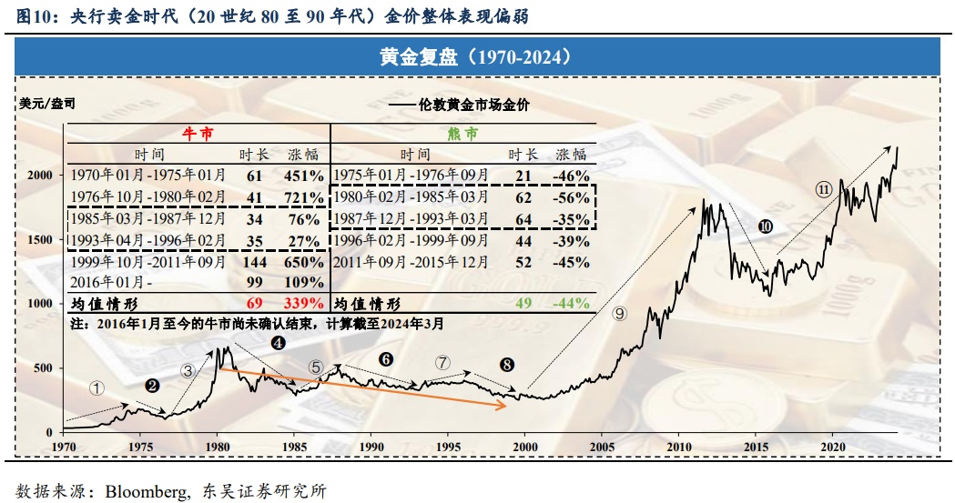 历史上曾出现过当央行趋势性卖金,导致黄金长期“牛短熊长”。我们之前系统性复盘过黄金50年的历史,20世纪80年代和90年代底,全球央行系统性减持黄金储备,导致的结果是出现明显的“牛短熊长”,20年间的三轮熊市平均持续57个月,而两轮牛市平均持续34.5个月,平均涨幅仅为51.5%,在历届黄金牛市中垫底。
