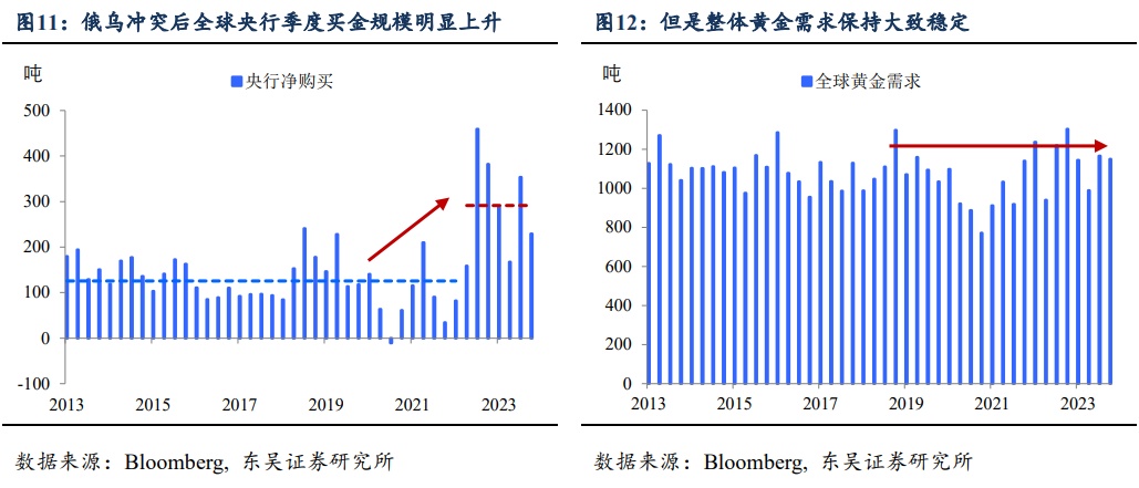 而当全球央行开始出现趋势性买金,黄金很可能将呈现“熊短牛长”的特点。2022年3月俄乌冲突爆发后,从第二季度开始,全球央行明显加大了黄金净购买——截至2023年Q4,季均净购买由2013年至疫情前的126吨上升至291吨。而且在后疫情时代的宏观叙事下,这一趋势应该还会持续。从中长期看这很可能将成为黄金长牛市的基础。