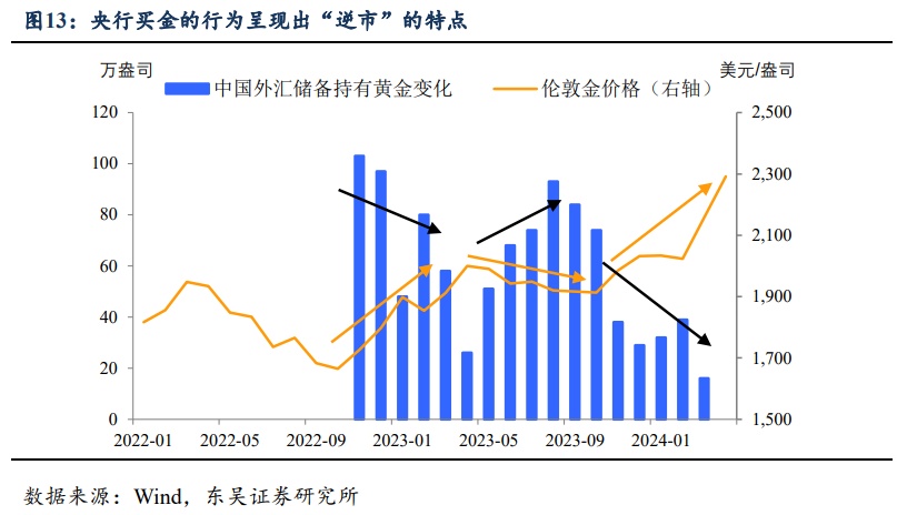 从短期看,央行买金不是金价上涨的直接驱动因素,而是让金价“跌不下去”的支撑因素。一方面,尽管央行增加购金,但是全球黄金的整体需求并没出现明显的增加;另一方面,可能更重要的是,央行买金呈现明显的“逆向操作”特征——金价上涨时减少购买,金价下跌时增加购买。因此相较于直接推动计价上涨,我们认为更可能的影响是稳定黄金的下跌幅度。