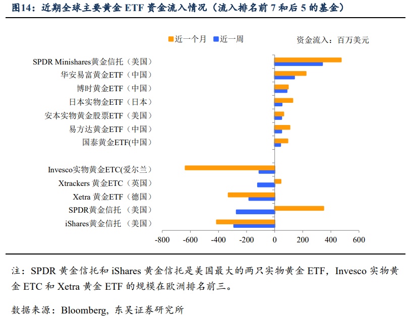 从短期投资资金入手,近期这轮黄金上涨可能是“散户”属性更强,而且亚洲地区令人瞩目。我们梳理了近期全球主要黄金ETF的资金流入情况,最近一周资金流入排名靠前的是美国的SPDR Minishares黄金信托和来自中国大陆和日本的几只黄金ETF,垫底的则是欧美的大型黄金ETF。