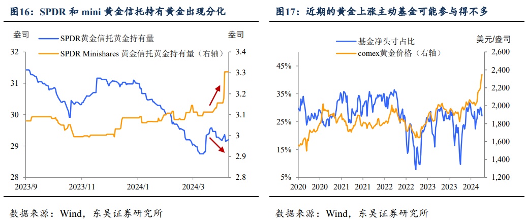 SPDR Minishares黄金信托规模的大涨更多体现的是小额、长期持有的需求上涨,机构的参与度可能有限。SPDR黄金信托(全球最大的黄金信托)和SPDR Minishares黄金信托同属于美国道富集团,与前者相比,minshares的优势在于每股对应的金额小、费率很低(0.18% VS SPDR 0.4%),但是劣势在于流动性较差。