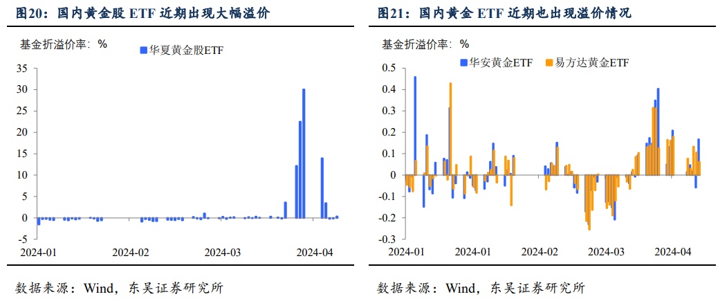 亚洲尤其是中国市场对于黄金的追捧在今年明显升温。除了国内主要黄金ETF资金流入量大外,还体现在三个方面:第一,尽管今年海外黄金上涨迅猛,国内金价相对海外仍存在较高的溢价;第二,国内主要的黄金ETF3月下旬以来出现了一轮明显的溢价(收盘价高于净值)行情;第三,今年新设立的黄金股ETF在4月初出现一轮夸张的溢价行情。