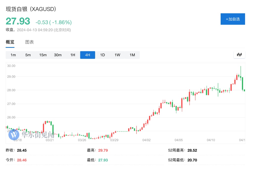 金价飙涨引发多米诺效应,3月以来,白银的涨幅甚至超过了黄金,现货白银价格今年迄今已经累计上涨超过20%,远远好于现货黄金15.4%的涨幅。
