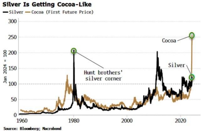 Simon White解释道,与可可相比,白银市场上期货合约的交易量相对于实际的供应量更大,当需求激增时(如投资者大量买入白银期货),白银价格可能会迅速上涨: