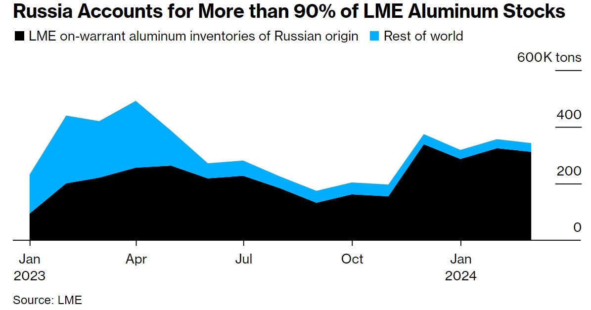在铝市场,据估计,LME系统之外持有的俄罗斯金属数量从几十万吨到多达100万吨不等。