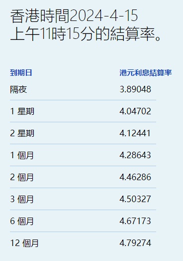 智通财经APP获悉,4月15日,港元短期拆息轻微回升,其中,隔夜息由近一个月低位反弹至3.89048%,与楼按相关的一个月拆息结束十连跌,今报4.28643%。