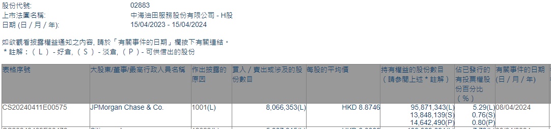 智通财经APP获悉,香港联交所最新资料显示,4月8日,JPMorgan Chase & Co.增持中海油田服务(02883)806.6353万股,每股作价8.8746港元,总金额约为7158.57万港元。增持后最新持股数目约为9587.13万股,最新持股比例为5.29%。