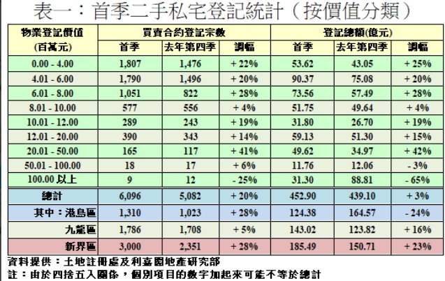 按楼价划分,今年首季在9个楼价组别当中,录得八升一跌,当中以楼价介乎2001至5000万港元者录得最大升幅,季内有165宗买卖登记,按季大升41%;而601万港元至800万港元及400万港元以内两个楼价组别亦分别升28%及22%,各录1051宗及1807宗登记,为登记占比较多的两个银码层类别,反映中细价物业逆市中仍有刚性需求。至于登记量次多的401万港元至600万港元楼价组别,也录1790宗登记,按季亦升20%。