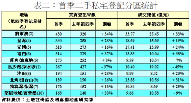 按地区分析,从买卖最活跃的十个地区观察,今年第一季录得九升一跌,升幅介乎8%至37%不等;当中以屯门区二手私宅登记量升幅最劲,季内录得314宗登记,按季大升37%;而将军澳区及沙田区登记量亦分别录得34%及28%的升幅,各录430宗及194宗;而当中前者的将军澳区更成为登记量最活跃的地区。