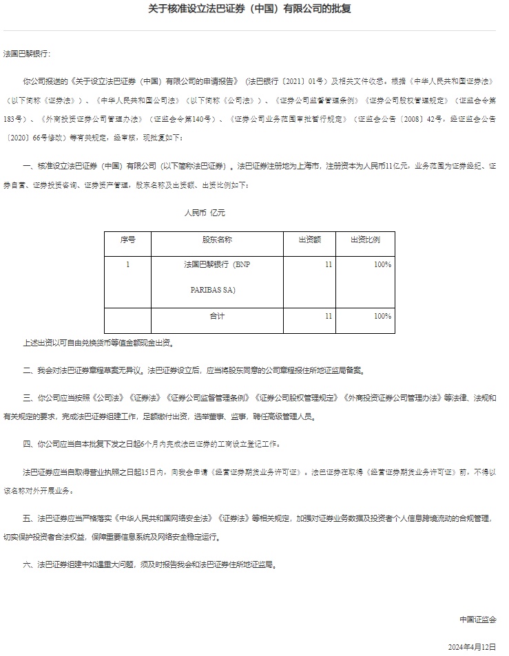 智通财经APP获悉,4月15日,证监会发布关于核准设立法巴证券(中国)有限公司(简称:法巴证券)的批复。法巴证券注册地为上海市,注册资本为人民币11亿元,业务范围为证券经纪、证券自营、证券投资咨询、证券资产管理,法国巴黎银行(BNP PARIBAS SA) 出资比例100%。