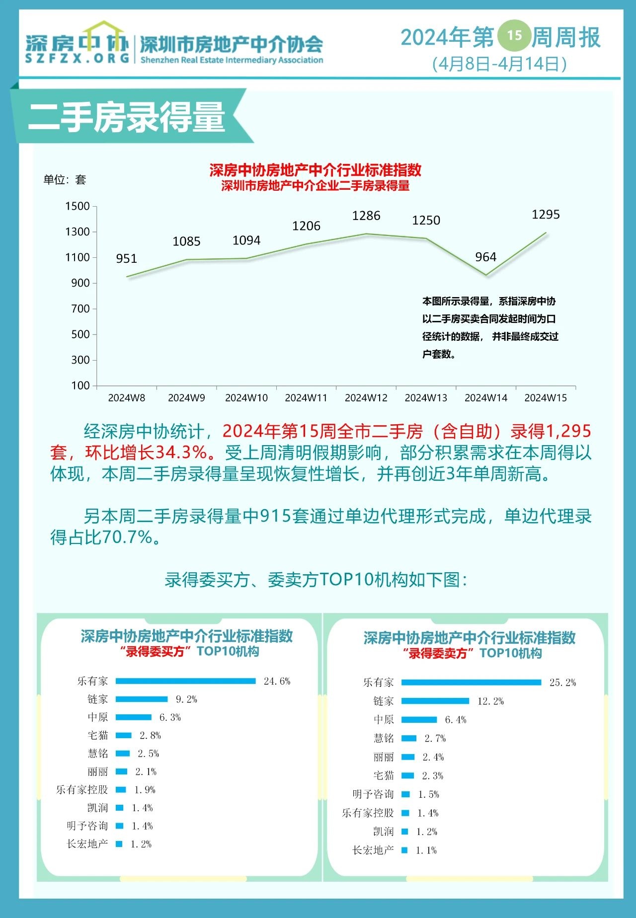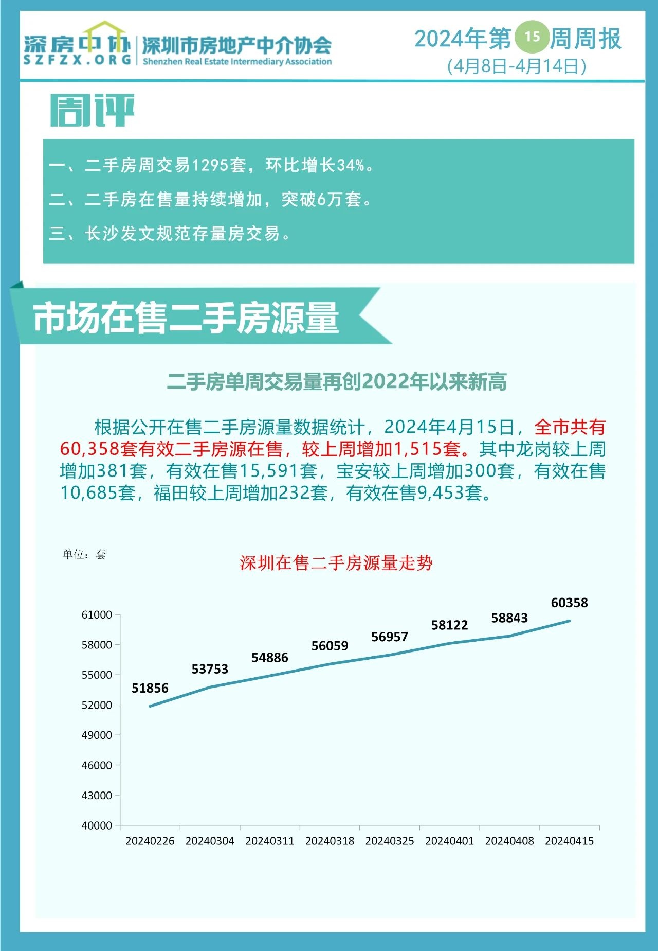智通财经APP获悉,4月15日,经深圳市房地产中介协会统计,2024年第15周(4月8日至4月14日),深圳全市二手房成交量(含自助)录得1295套,环比增长34.3%,单周交易量再创2022年以来新高。深圳市房地产中介协会监测显示,受此前一周清明假期影响,部分积累需求在本周得以体现,本周二手房录得量呈现恢复性增长,并再创近3年单周新高。根据公开在售二手房源量数据统计,2024年4月15日,深圳全市共有60358套有效二手房源在售,较前一周增加1515套。