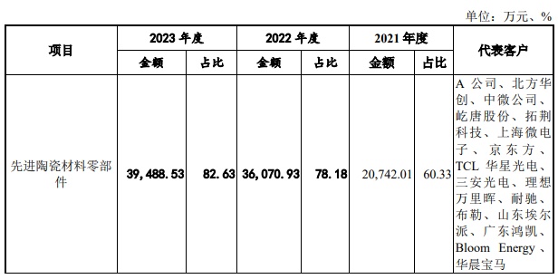 截至招股说明书签署日(4月9日),公司已通过A公司显示面板制造CVD工序的表面处理服务认证,成为A公司在国内少数认证配套厂商之一。根据IHS数据,A公司在显示面板 CVD 设备占据全球超过 80%的市场份额。核心客户端,公司目前是A公司在中国少数的先进结构陶瓷供应商之一,是北方华创连续三年全球金牌供应商。
