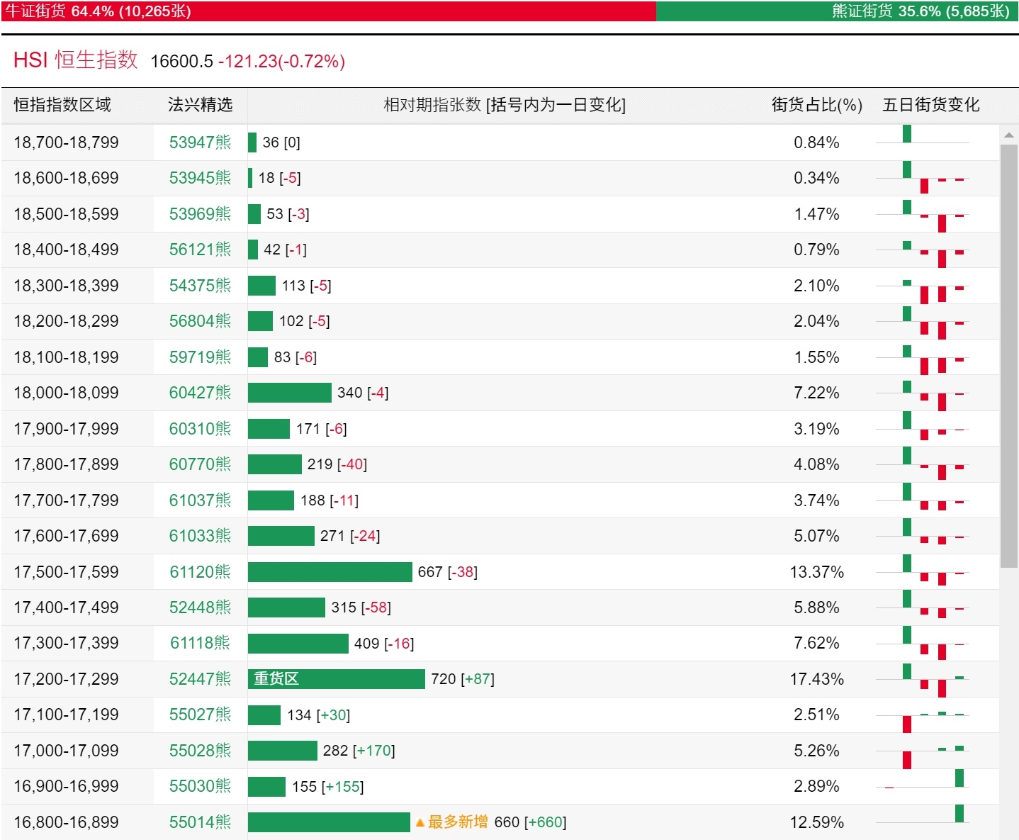 法兴恒指牛熊证街货分布图中的数据显示,熊证街货重货区在17200-17299区间,该区间最新熊证数量为720张,较上一交易日增加87张;最多新增在16800-16899区间,该区间最新熊证数量为660张,较上一交易日增加660张。