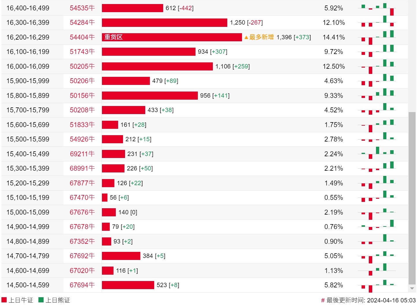 牛证街货重货区和最多新增都在16200-16299区间,该区间最新牛证数量为1396张,较上一交易日增加373张。