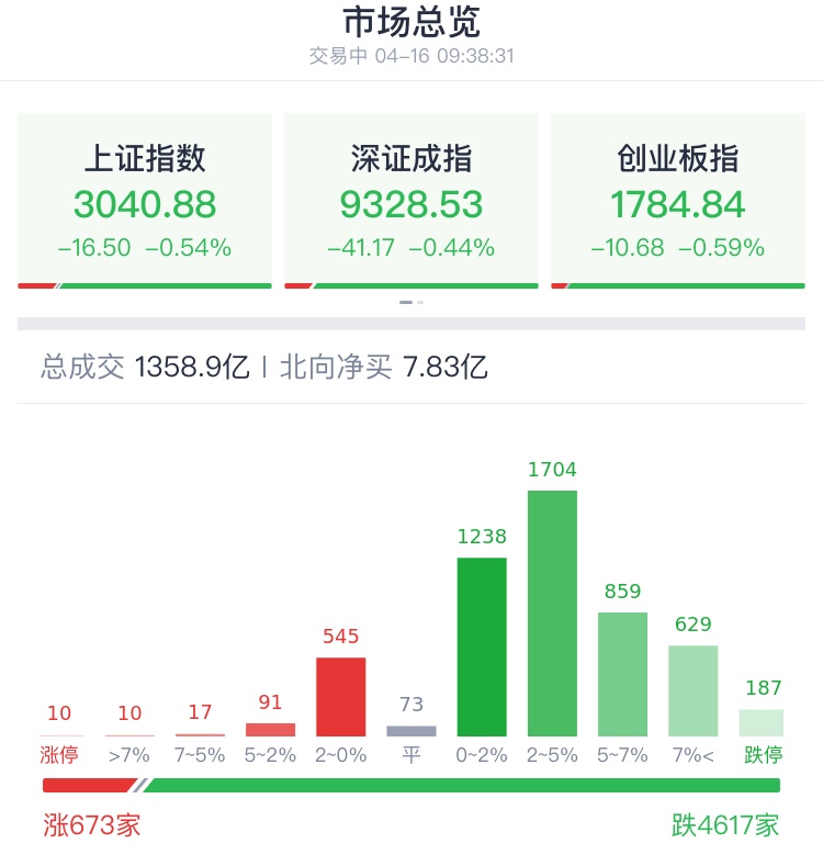 受中东局势升级和美债走高影响,隔夜美股收跌。4月16日,A股早盘走弱,盘面上,中字头个股拉升护盘,微盘股继续大跌,指数跌超8%,近300股跌超9%,旅游、新型工业化等板块跌幅居前。