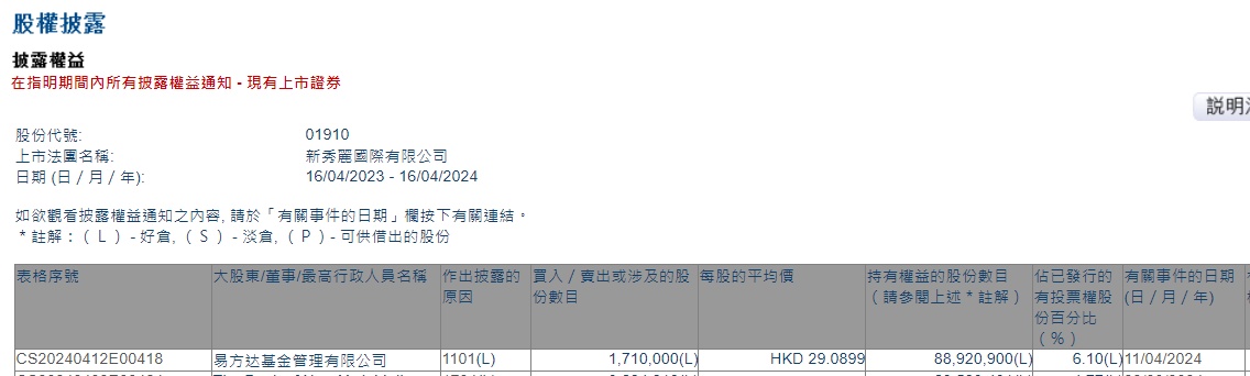 智通财经APP获悉,香港联交所最新资料显示,4月11日,易方达基金增持新秀丽(01910)171万股,每股作价29.0899港元,总金额约为4974.37万港元。增持后最新持股数目为8892.09万股,最新持股比例为6.10%。