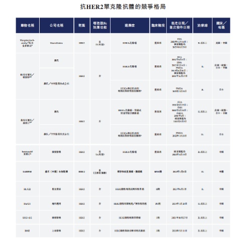 根据弗若斯特沙利文的资料,自FDA于1998年批准罗氏开发的首个抗HER2抗体赫赛汀或曲妥珠单抗以来,共有4种抗HER2 mAb在美国及中国获得用于肿瘤治疗的上市许可。马吉妥昔单抗、玛格妥昔单抗、帕捷特及赫赛汀已获FDA批准。伊尼妥单抗(或赛普汀)、帕捷特及赫赛汀已获国家药监局批准。