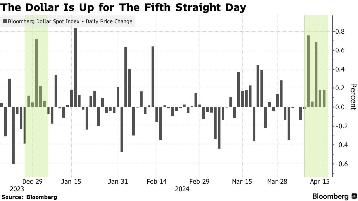 上周公布的美国3月CPI数据再度超出预期,导致投资者减少了对美联储今年降息次数和幅度的押注,中东地区紧张局势的升级也提振了对美元的避险需求。这些因素都引发了美元的上涨。而周一公布的美国3月零售销售数据大幅超出预期,使美元涨势得以延续。