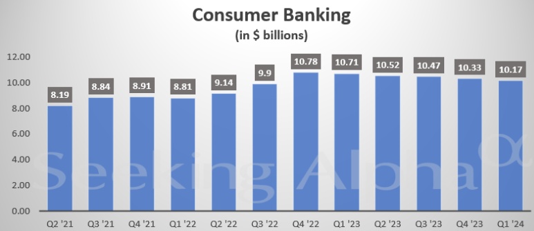 消费者银行业务收入为102亿美元,上一季度为103亿美元,上年同期为107亿美元;净利润为26.6亿美元,低于上一季度的27.7亿美元和上年同期的31.1亿美元。存款平均余额为9525亿美元,低于2023年第四季度的9592亿美元。信用卡/借记卡总支出为2194亿美元,同比增长5%。