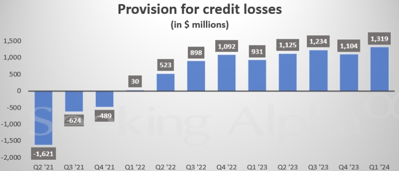 美国银行第一季度拨备了更多资金以应对不良贷款。Q1信贷损失拨备为13亿美元,高于2023年第四季度的11亿美元和2023年第一季度的9.31亿美元。其中,净冲销为15亿美元,较2023年第四季度增长26%;信用卡冲销的增加主要是上一季度遗留下来的,目前正在趋于平缓。
