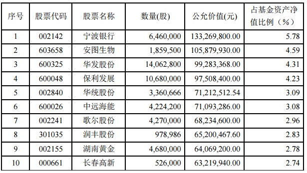 在另外几只丘栋荣管理的基金中,变化比较大的还有中庚价值灵动灵活配置。该基金在一季度最大的变化是前十大重仓股更换了4只。其中,湖南黄金(002155.SZ)、长春高新(000661.SZ)、润丰股份(301035 .SZ)、华统股份新进到前十大,水晶光电(002273.SZ)、上海瀚讯(300762.SZ)、凯因科技(688687.SH)、康华生物(300841.SZ)退出前十大。