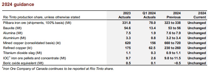 尽管产量和出货量有所下降,但力拓在所有业务中仍维持其产量指引。其中,该公司预计2024年铁矿石出货量将保持在3.23至3.38亿吨,铁矿石出货量和铝土矿产量指引仍受天气影响。