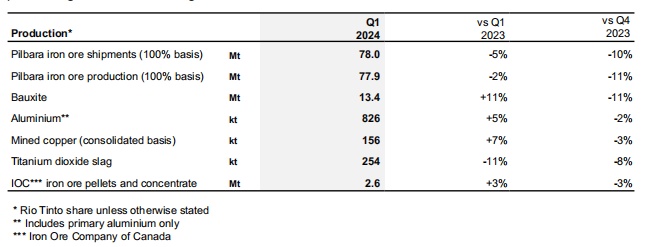 智通财经APP获悉,力拓(RIO.US)公布了2024年第一季度生产结果。报告显示,该公司铁矿石产量和出货量均有所下降。