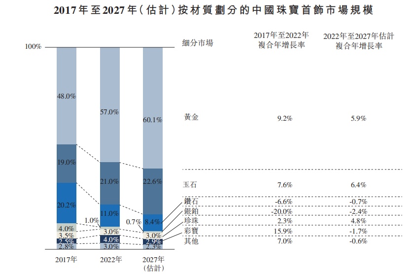 上述多重需求的驱动之下,近年来国内黄金珠宝市场也不断扩大。2022年,黄金珠宝市场销售收入为人民币4,098亿元,占整个珠宝市场的57.0%,预计2027年将达到人民币5,465亿元,复合年增长率为5.9%,继续保持增长之势。