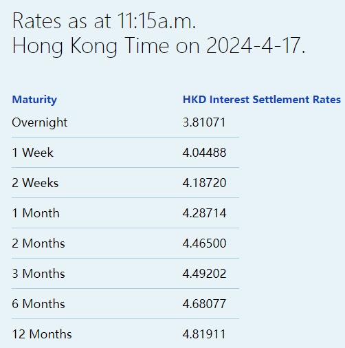 智通财经APP获悉,4月17日,港元拆息涨跌不一,其中,隔夜拆息回落13基点至3.81071%,为3月14日以来最低,与楼按相关的一个月拆息亦结束两连升,报4.28714%。