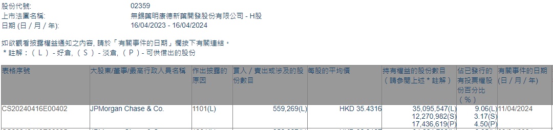 智通财经APP获悉,香港联交所最新资料显示,4月11日,小摩增持药明康德(02359)55.9269万股,每股作价35.4316港元,总金额约为1981.58万港元。增持后最新持股数目约为3509.55万股,最新持股比例为9.06%。