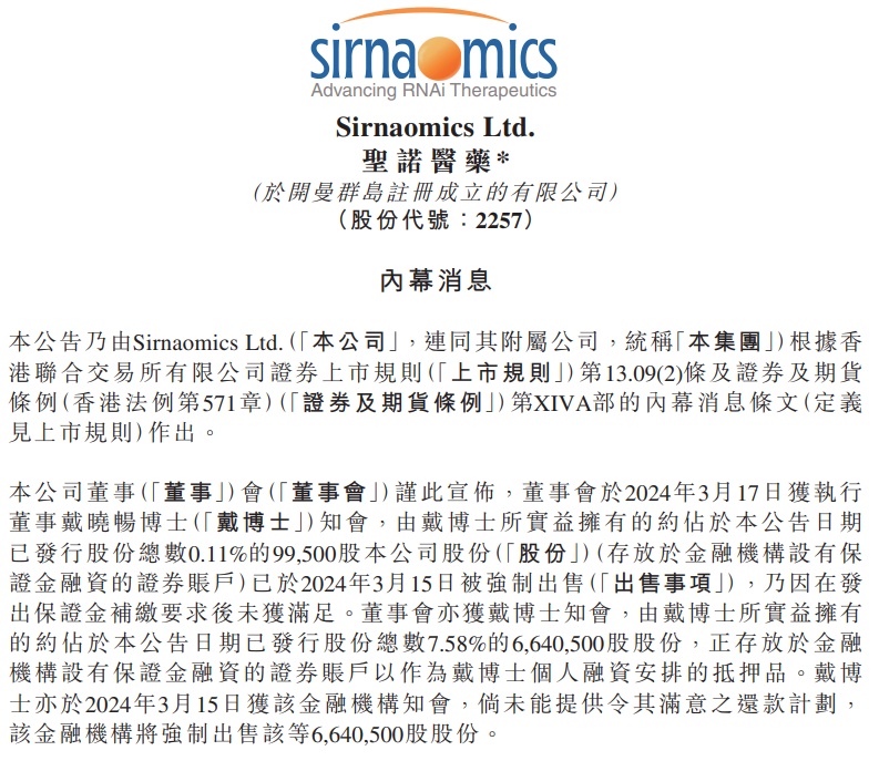 3月18日,圣诺医药再次公告表示,执行董事戴晓畅再次因为保证金补缴要求未获满足,其持有的9.95万股股份已在3月15日被强制出售。另外,戴晓畅持有782.8万股股份,其中的664.05万股股份正存放于金融机构设有保证金融资的证券账户以作为其个人融资安排的抵押品。该部分股份占圣诺医药股份的7.58%,倘未能提供令金融机构满意的还款计划,该部分股份也将被强制出售。