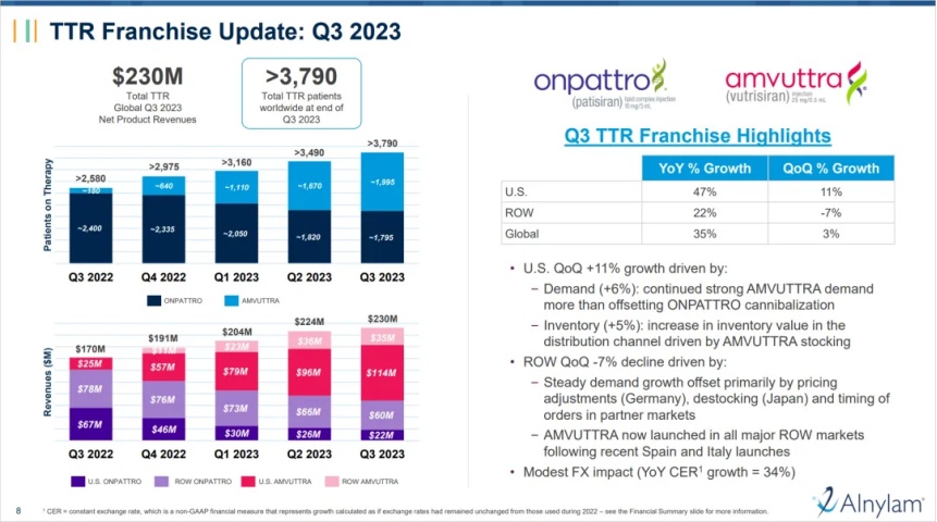 参考目前全球首款siRNA药物和首个RNAi药物patisiran的商业化之路。Alnylam的2023年3季度报显示,patisiran的使用患者人数在去年3季度正式被vutrisiran超越,而其销售额早在去年年初便被Vutrisiran超越。这也意味着Vutrisiran作为一款2022年6月才上市的药物,在半年时间之内就取代了上一代产品,成为了Alnylam最新的收入支柱。这不禁让人怀疑siRNA药物的技术迭代和商业化寿命,而这或许会影响市场对同为小核酸药物的STP705的价值判断。