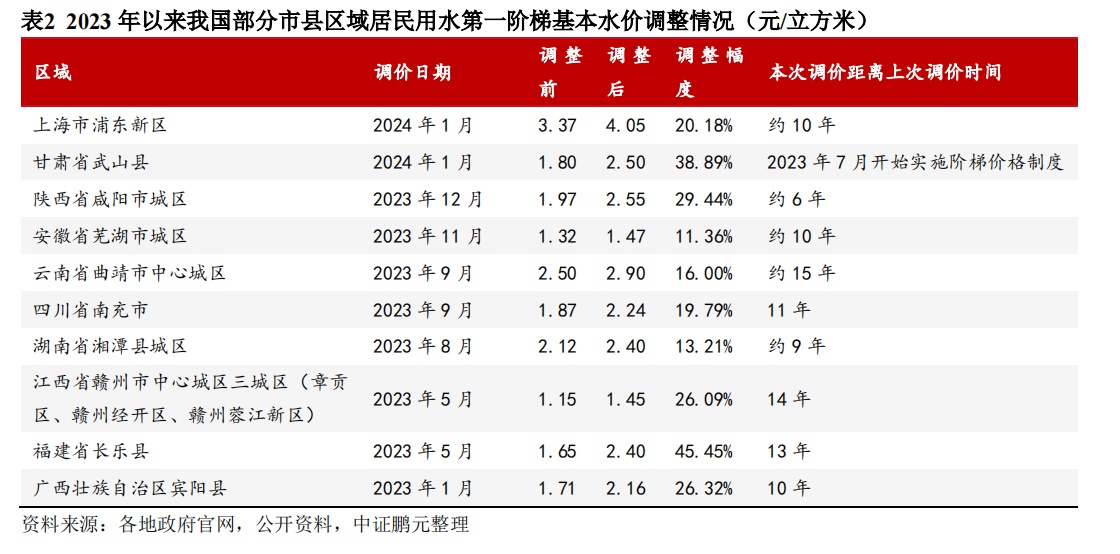 事实上,若从行业层面来看,虽然2020年以来由于疫情的影响导致全国大部分地区的水价调整未能及时推进,但自2023年以来,各地水价调整已加速启动。