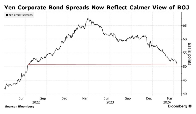 相关指数显示,周三,国内外发行的日元公司债券息差从一年前的66个基点左右收窄至51个基点左右。