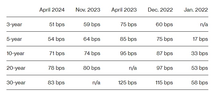 此次交易的额外收益低于伯克希尔过去两年的债券销售。以三年期债券为例,该公司提供了51个基点的中期掉期利差,而去年11月和4月分别为59个基点和75个基点。