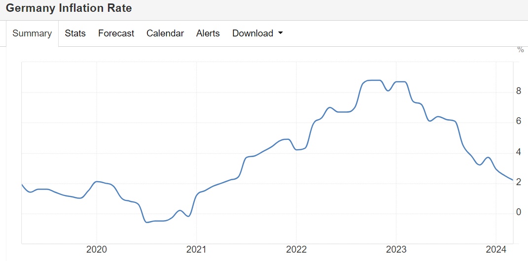 欧洲最大经济体德国的通货膨胀率已经降至2.3%,相比于2月份通胀明显下行,并且创下2021年6月以来的最低水平。政府较为看重的核心通胀率方面,德国3月份剔除波动较大的食品和能源价格的核心通胀率为3.3%,创下2022年 6月以来的最低水平,并且低于2月份的3.4%。