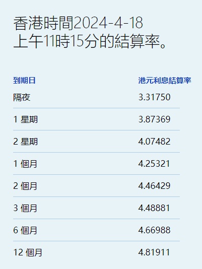 智通财经APP获悉,4月18日,港元拆息几乎全线下跌。其中,隔夜息急跌49基点至3.3175%,为1月26日以来最低,与楼按相关的一个月拆息连跌两天,报4.25321%,再创逾七个月新低。