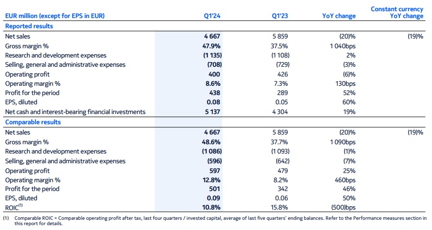 智通财经APP获悉,4月18日,诺基亚(NOK.US)公布了2024年第一季度财务业绩。财报显示,诺基亚Q1净销售额为46.67亿欧元,同比下降20%,不及分析师普遍预期的49.6亿欧元。经调整的营业利润为5.97亿欧元,同比增长25%,好于分析师普遍预期的5.69亿欧元;经调整的每股收益为0.09美元,上年同期为0.06美元。