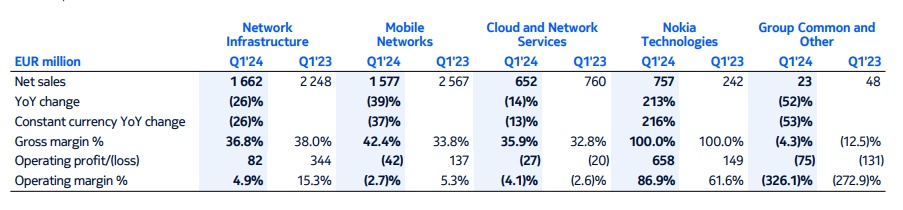 按业务划分,网络基础设施业务净销售额为16.62亿欧元,同比下降26%;移动网络业务净销售额为15.77亿欧元,同比下降39%;云及网络服务业务净销售额为6.52亿欧元,同比下降14%;诺基亚技术业务净销售额为7.57亿欧元,同比增长213%。