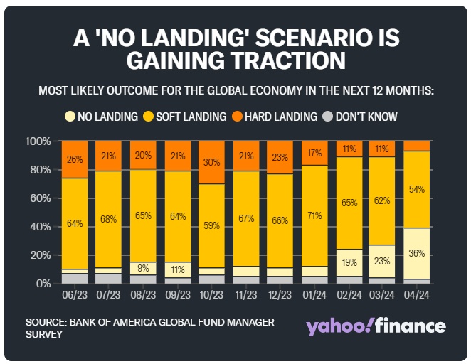 在美国银行周二公布的全球基金经理调查中,36%的受访者表示,他们认为未来12个月全球经济最有可能的结果是“不着陆”。这一数字明显高于一个月前的23%,也是自2023年6月(美国银行图表上最早的日期)以来的最高水平。