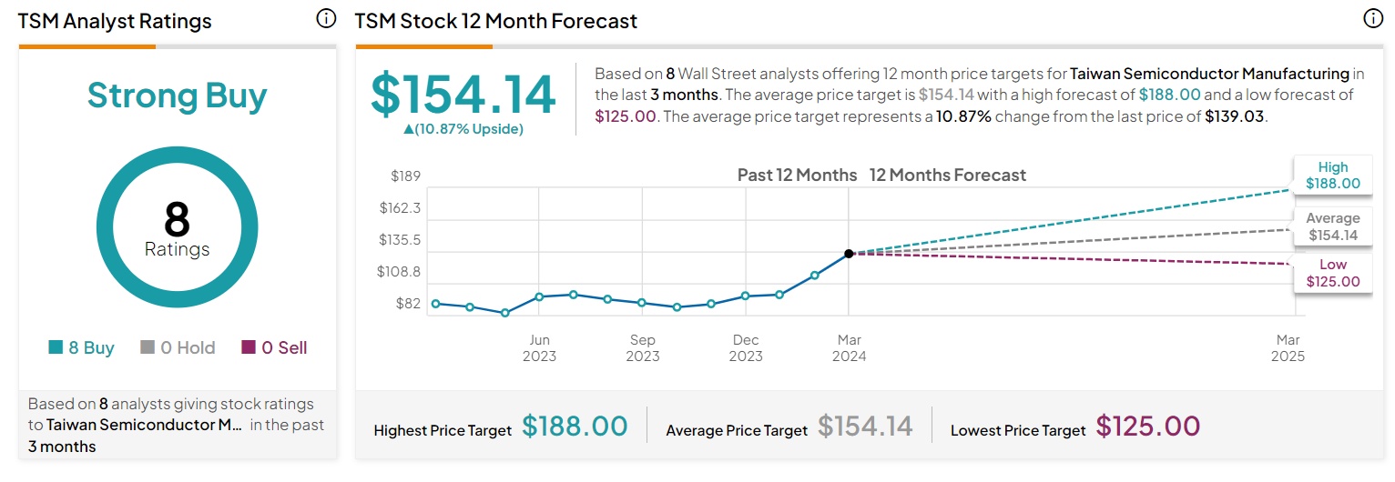 根据TipRanks汇编的华尔街分析师目标价,台积电ADR 12个月期限的最高看涨价位高达188美元(最新收盘价为139.030美元),分析师共识评级为“强力买入”。