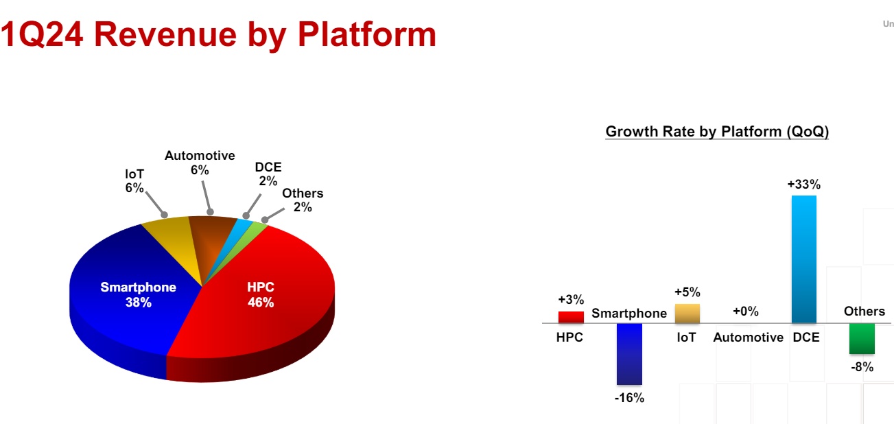 从台积电营收占比规模来看,以高性能的服务器GPU芯片(比如英伟达H100/H200 AI GPU以及AMD MI300X GPU)和PC端芯片为主的HPC业务以及智能手机业务仍然占据大部分比例,反映出这三大类型芯片若需求旺盛,有望带动整个芯片行业的复苏周期。业绩数据显示HPC业务营收占比高达46%,智能手机业务营收占比紧随其后,高达38%。