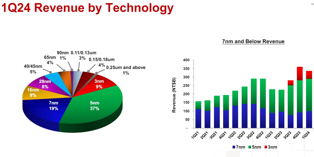 第一季度芯片制程营收数据方面,台积电当前最高端的3nm芯片制程带来的营收占总营收规模的9%, 5nm占37%,7nm占19%;先进技术(定义为7nm及更先进的技术)占台积电总营收规模的大约65%。据悉,英伟达H100/H200 AI GPU以及AMD MI300系列主要集中在5nm,英伟达B100/B200/GB200有望集中采用台积电3nm制程。