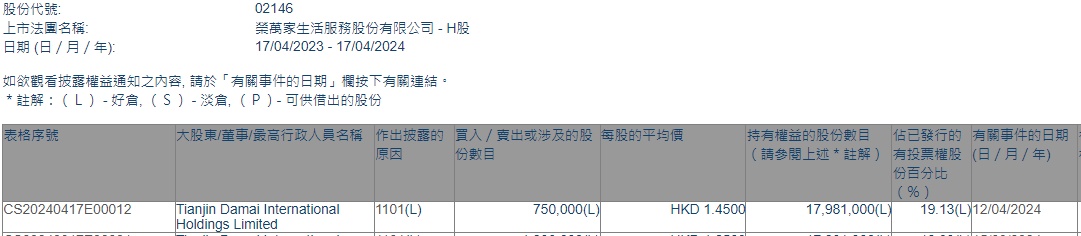 智通财经APP获悉,香港联交所最新资料显示,4月12日,Tianjin Damai lnternational Holdings Limited增持荣万家(02146)75万股,每股作价1.45港元,总金额为108.75万港元。增持后最新持股数目为1798.1万股,最新持股比例为19.13%。