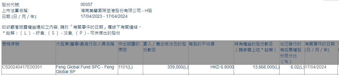 智通财经APP获悉,香港联交所最新资料显示,4月17日,Feng Global Fund SPC - Feng Global SP增持美兰空港(00357)33.9万股,每股作价6.8港元,总金额约为230.52万港元。增持后最新持股数目为1366.8万股,最新持股比例为6.02%。