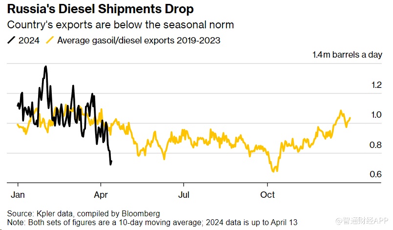 智通财经APP获悉,在无人机袭击俄罗斯炼油厂后的几个星期里,俄罗斯的柴油出口继续暴跌。分析公司Kpler的数据显示,在截至4月13日的10天里,平均每天发货量为74万桶。与2019年至2023年的平均水平相比,这一数字下降了约25%。