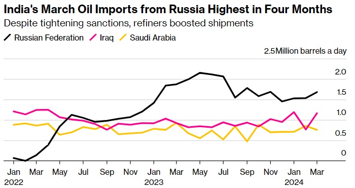 交易商们表示,在迪拜和香港等地成立新公司的便利性对创建快闪公司至关重要。就在几个月前,这些名字大多还没有被人见过或听说过,即便是那些熟悉该行业的人。在这些交易商以及之前的交易商的支持下,印度从俄罗斯的进口量从俄乌战争前的几乎为零,飙升至去年的峰值,达到200多万桶/天,之后略有下滑。