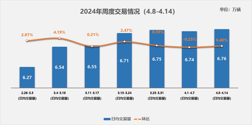 智通财经APP获悉,4月18日,中国汽车流通协会发布二手车周度快报。2024年4月第二周(4月8日-4月14日),二手车日均交易量6.76万辆,与上周环比增长0.40%,交易规模持续高位运行。按可比口径计算,2024年4月1日-14日,二手车交易量81万辆,因为清明小长假,有效的工作日较3月同期少一天,因此,虽4月份以来日均交易量持续高位,但总体的交易规模与同期相比少了1.3%。