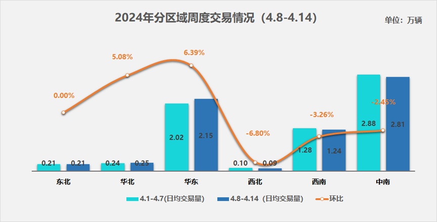 中南地区日均交易量维持在2.81万辆,环比下降2.45%。首先两广地区本周有小幅度的下滑,经调研主要还是在清明小长假的消费透支影响了本周的交易规模。