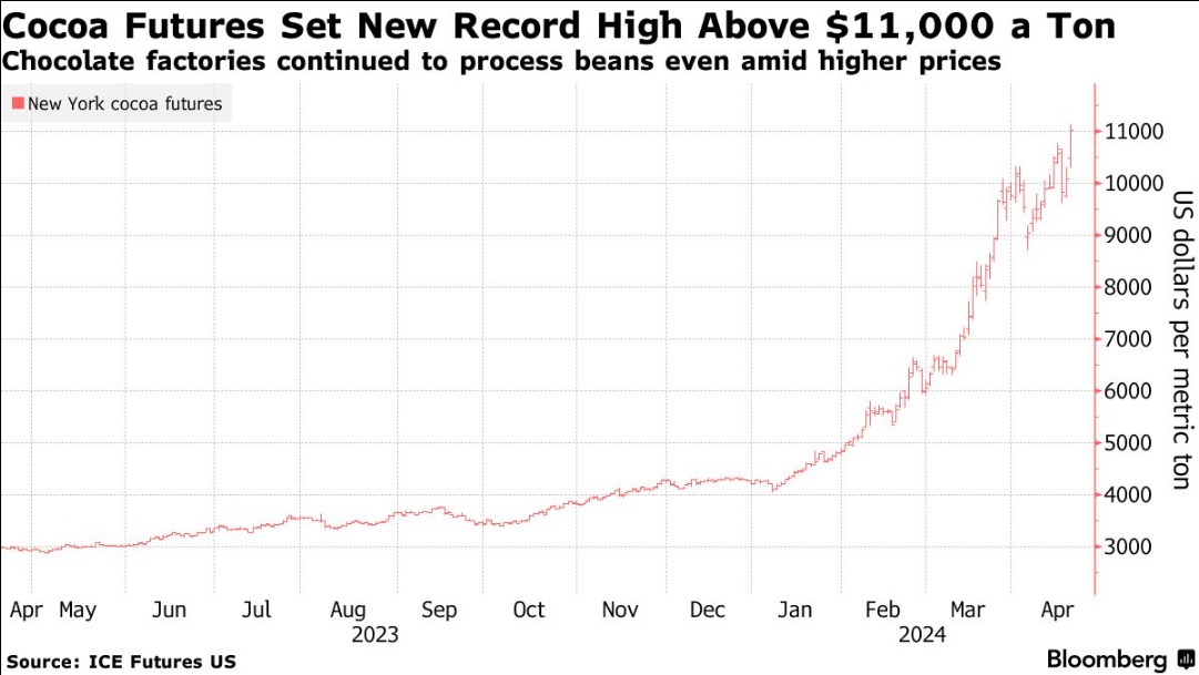由于西非主要种植户的收成不佳,导致全球粮食供应连续第三年出现短缺,今年的可可期货价格上涨了一倍多。